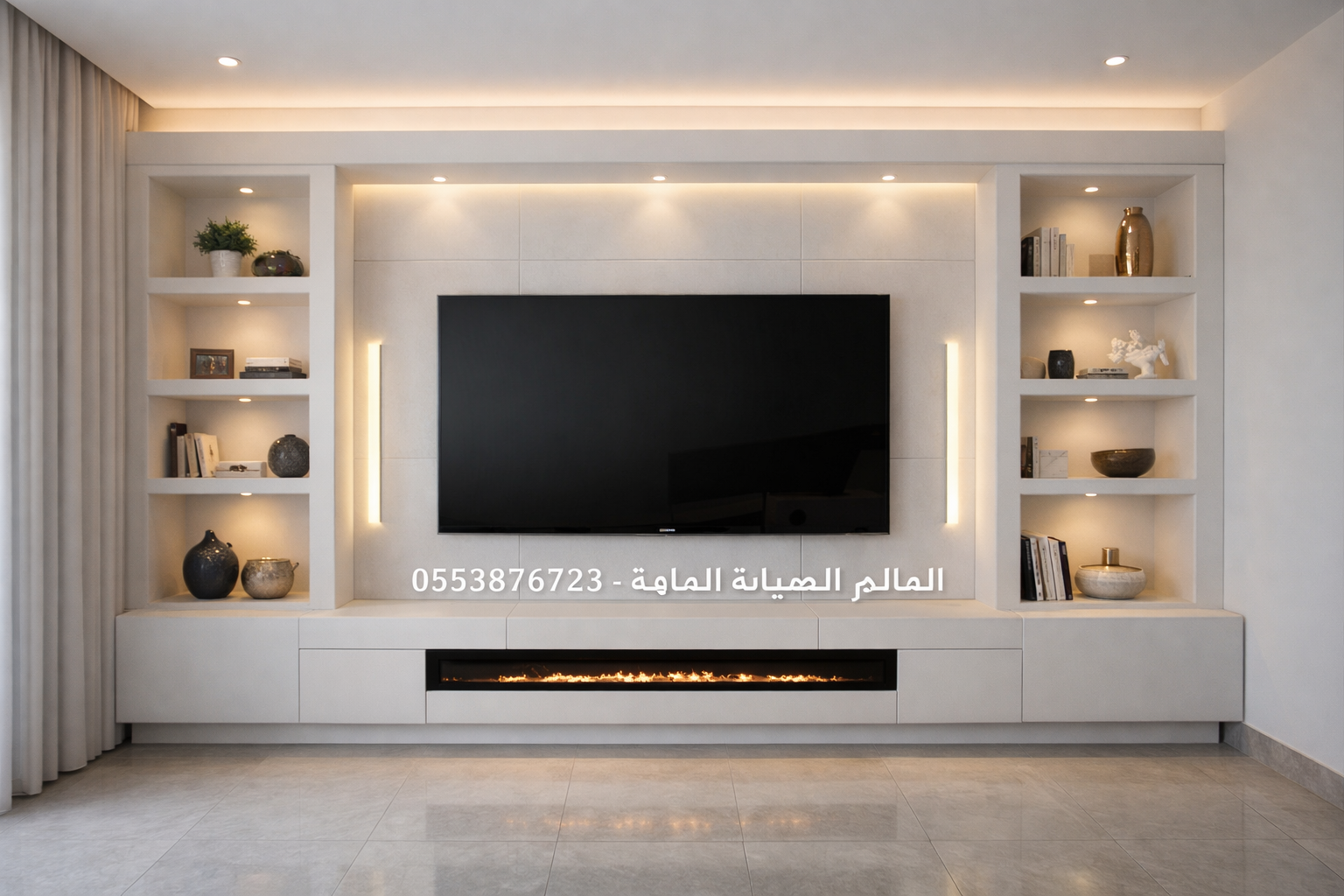 •وحدات التلفزيون المدمجة (TV Units): تعتبر وحدات التلفزيون المصنوعة من الجبس بورد من أحدث تصاميم عصرية، حيث يتم دمج الشاشة والإضاءة والأرفف بشكل متناغم، مما يلغي الحاجة إلى الأثاث التقليدي.