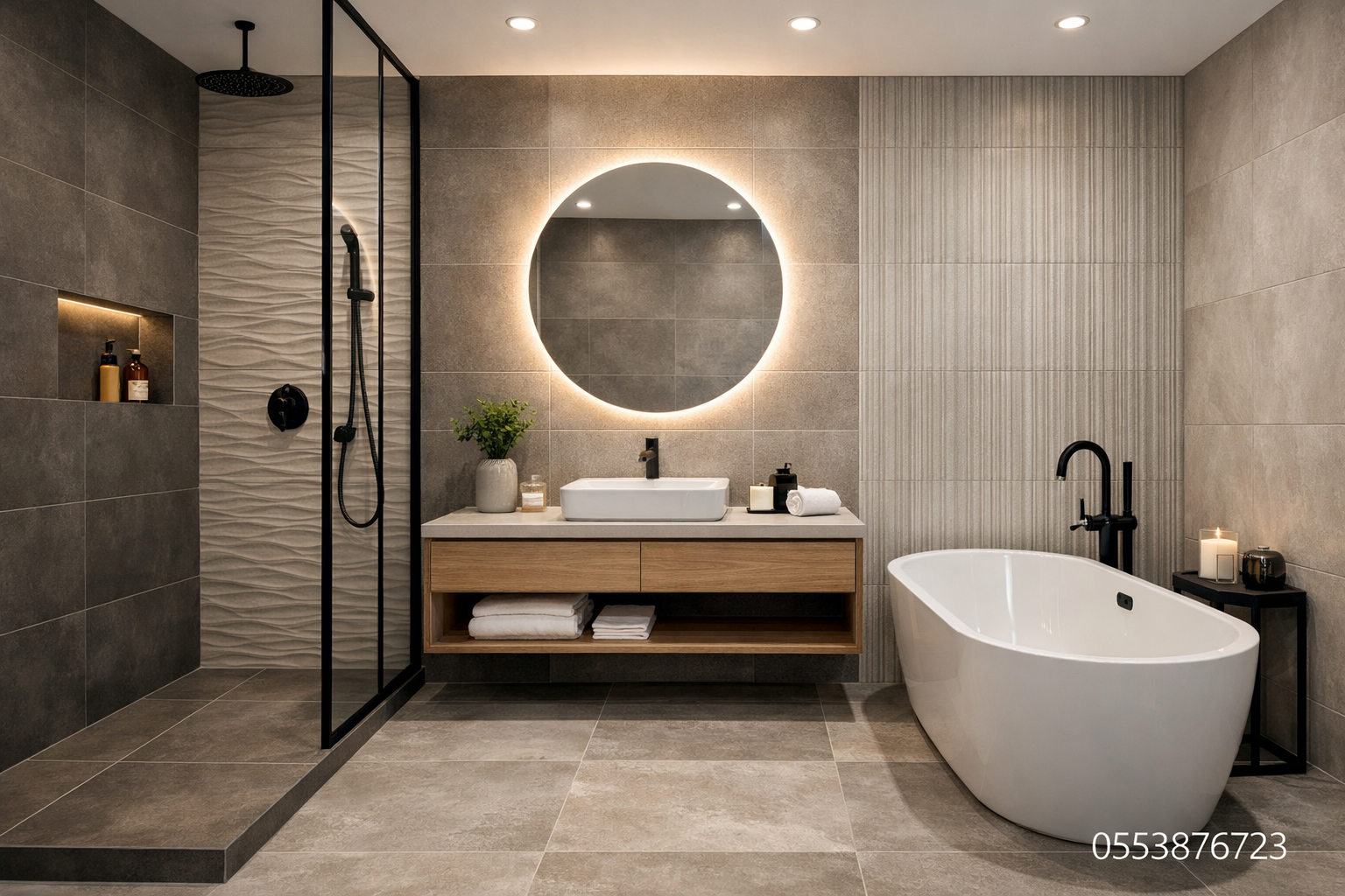 •الملمس (Texture): بلاط بملمس حجري أو رملي يضيف عمقاً للمساحة.